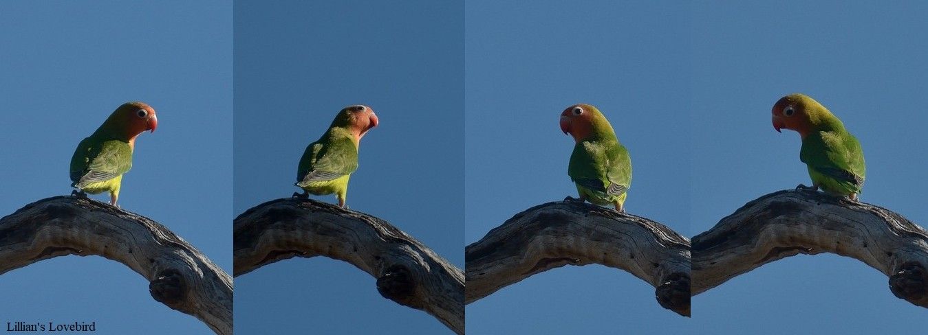 Although it was still quite cloudy some Lillian’s Lovebirds were photographed with one perched out in the open and staying there for a while for a change!