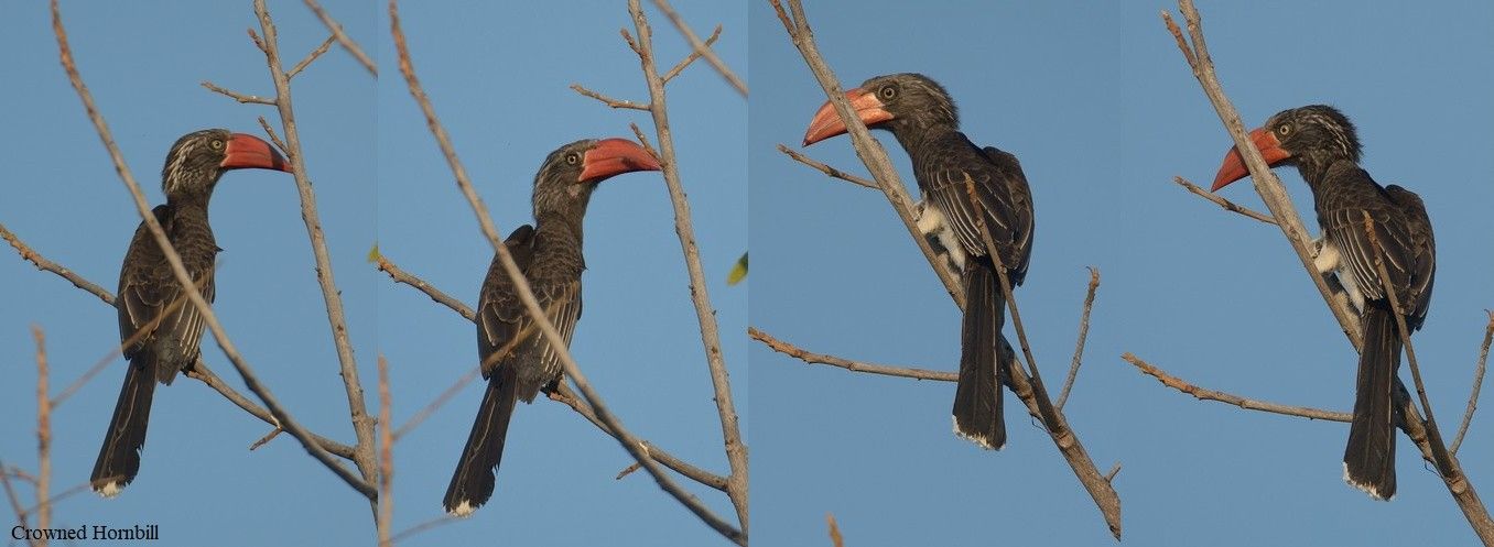 A Grey Go-away bird was perched at the top of a bush, then a Village Weaver (female?), a Crowned Hornbill left its perch and flew past and another Red-billed Firefinch was seen on the ground and perched in a bush.