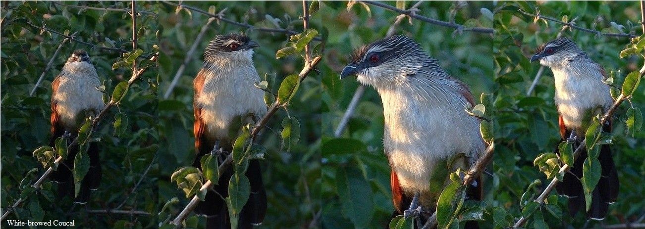 16 Lillian’s Lovebirds were perched in a tree and a White-browed Coucal was then seen on the ground as they always seemed to be, thus far!