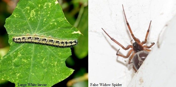 A Hummingbird Hawkmoth was once again in the garden (7th), Large White (larvae on Nasturtiums), Painted Lady and a Comma also. A female Sparrowhawk flew at a Starling on the feeders but missed and a False Widow Spider (possibly a Steatoda bipunctata) was just outside the shed door frame.