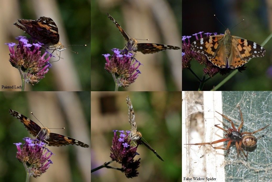 Painted Lady, Peacock and Large White were seen (19th) and a Common Darter was at the front of the property on the wall, whilst a Migrant Hawker flew past the back garden and a Hedgehog was seen several times between 20.30 and 22.00. Appearing again near the shed was a False Widow Spider, this time; possibly Steatoda nobilis.