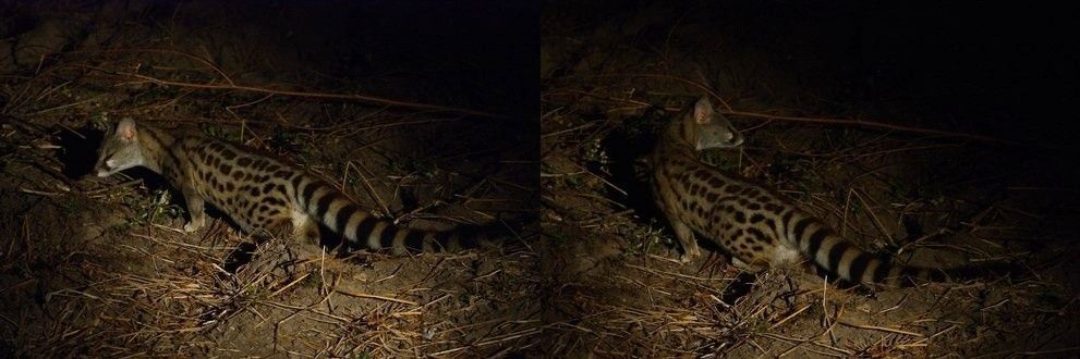 A Large Spotted Genet was then highlighted sat on top of a Termite mound; the white triangles under its eyes very obvious, but if they have any practical function (such as reflecting light) I do not know at this point.