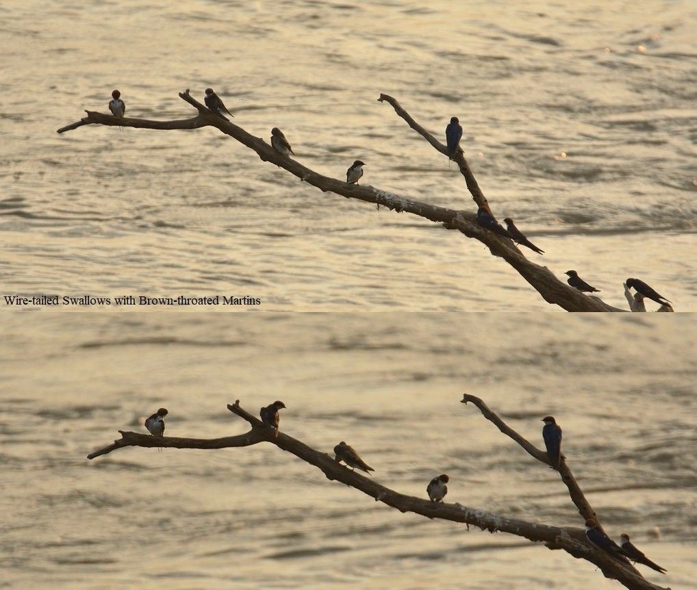 A Yellow-billed Stork was feeding in the river and then 5 Great White Pelicans flew in and landed on the far bank of the river, where there were also 6 African Spoonbills and a few Hirundines were flying around, possibly Banded Martin and Wire-tailed Swallow.