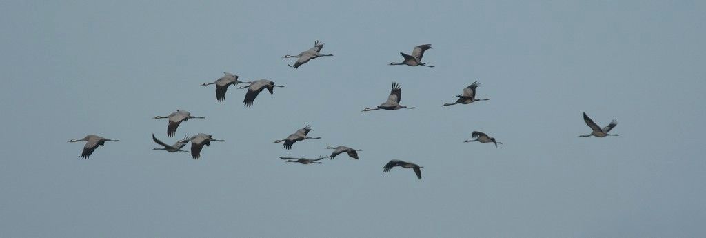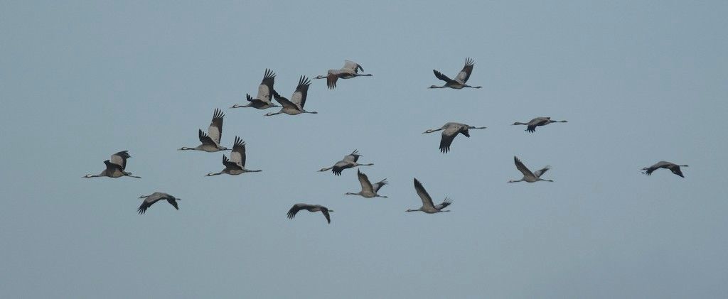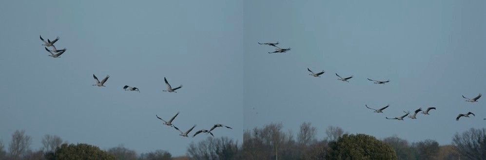 I counted 22 Cranes and there were at least 2 juveniles amongst them. However, someone, presumably from the local farming community decided to wander across the fields near to the Cranes and several of them took flight. A little while later the remaining Cranes took flight, but gave the opportunity for some flight shots. At least 6 Brown Hares were seen here with some chasing going on.